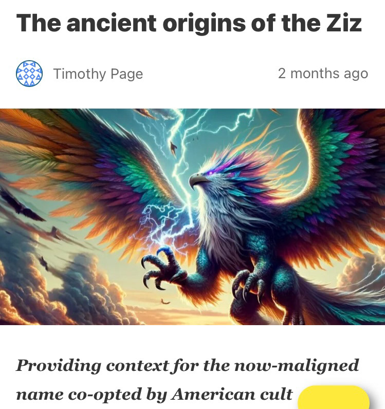 Timothy is v. upset that the Ziz remains so under-appreciated, while Mz. Ziz has skyrocketed to global fame. He laments that “this remarkable figure [which] has survived in religious and cultural memory for thousands of years” has now been “appropriated” by a “violent cult”!