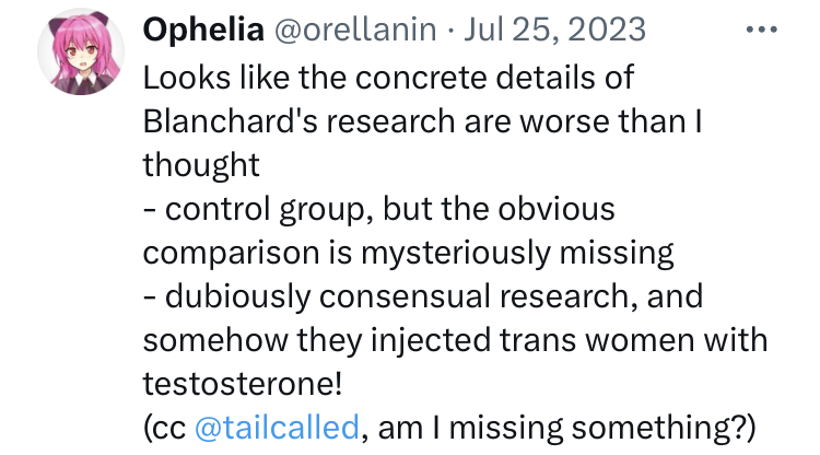 😮💨 Our post-Andy blood pressure goes back to normal as we find Ophelia deftly dispersing w/ Ray Blanchard’s disgraced autogynephilia hypothesis— y’know, that démodé rumor which Rationalist clowns so loved to hit Ziz w/: